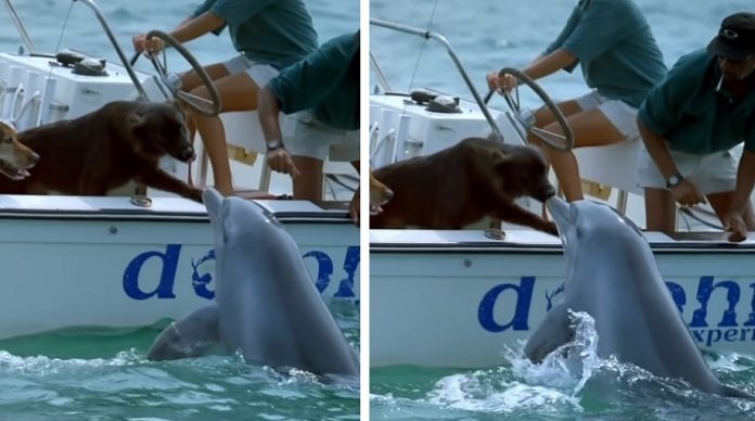 Nel video, che dura solamente una manciata di secondi, si può vedere una piccola imbarcazione con a bordo due persone e due cani che sono incuriositi dalla presenza di due delfini che giocano ad inseguire il mezzo. Tuttavia, ad un certo punto, uno dei due simpatici delfini fa un salto fuori dall’acqua, quanto basta per raggiungere il musetto del cane più scuro per dargli un “bacino”.