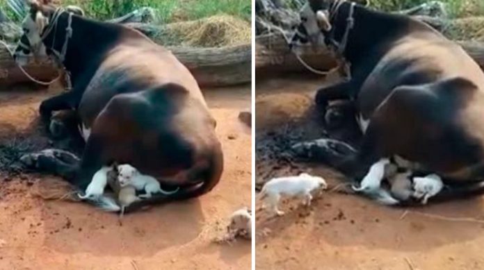 Questo è proprio quello che stava per capitare qualche tempo fa in India, nello stato di Karnataka, dopo che la mamma di sette cagnolini appena nati è venuta a mancare durante il parto. Hanumantha Saali, il proprietario dei cuccioli era molto preoccupato per il loro destino, poiché durante le prime ore provò a fare di tutto per cercare di alimentarli ma senza ottenere alcun risultato, fino a quando decise di provare ad avvicinare i piccoli ad una delle loro mucche che aveva partorito di recente e che in quel momento era sdraiata a terra.