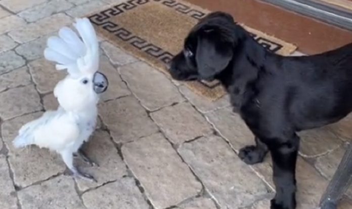 @theparrotlady Answer @im_siowei this moment will forever be in my heart ❤️☺️ #friendship #puppy #lab #baby #2021 #cockatoo #parrot #reaction #pov