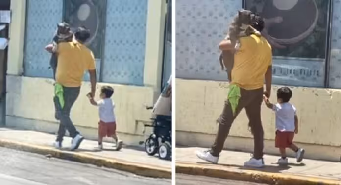 In pratica, l’uomo anziché portare in braccio il suo bambino di circa quattro anni, teneva tra le braccia il loro bel cagnolone. Ma, chiaramente, c’è un valido motivo che l’ha portato a fare questa scelta, poiché, quel giorno, a causa delle alte temperature, l’asfalto era molto caldo e il cane avrebbe potuto farsi male alle zampe.