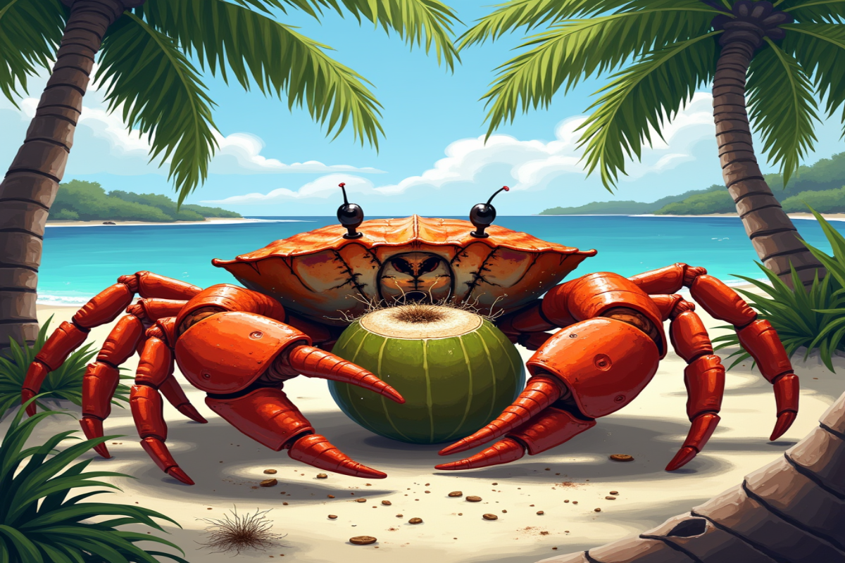 Il nome “granchio di cocco” deriva dalla sua abitudine alimentare e dalla straordinaria capacità di aprire uno dei frutti più resistenti della natura. Il procedimento è affascinante: prima il granchio rimuove con cura la fibrosa buccia esterna con le pinze più piccole, poi individua il punto debole del guscio, uno dei tre “occhi”, e con un colpo deciso lo spacca, accedendo così alla polpa ricca di nutrienti.