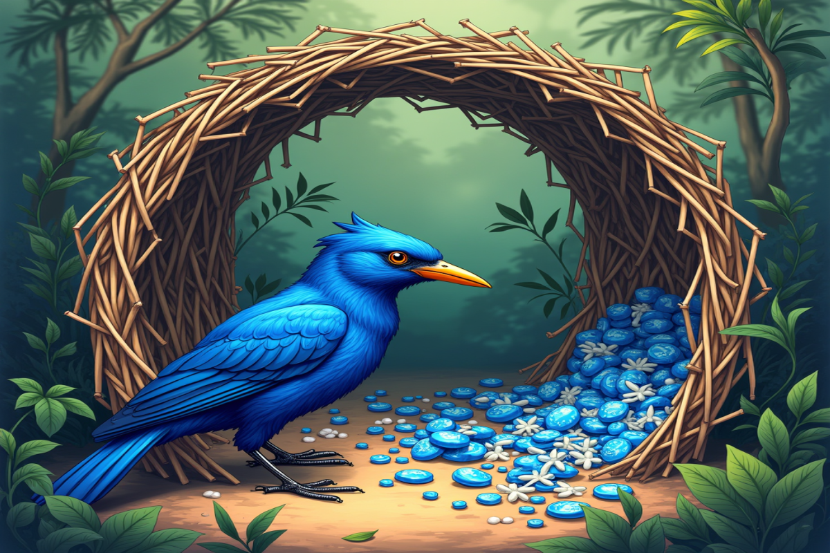 Ma la parte più affascinante è la decorazione. Il Satin Bowerbird (Ptilonorhynchus violaceus) colleziona oggetti blu come fiori, bacche, penne e anche tappi di bottiglia o pezzi di plastica, che dispone con cura davanti alla sua costruzione. Il Great Bowerbird (Chlamydera nuchalis) organizza oggetti per dimensione, creando una prospettiva che fa sembrare il bower più grande quando la femmina lo guarda dall’ingresso.
