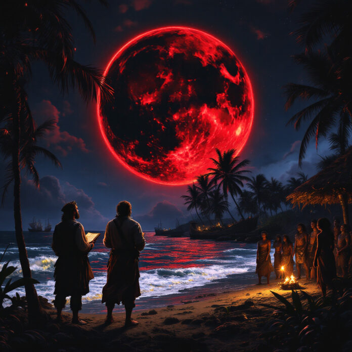 La sera stabilita, la Luna iniziò lentamente a oscurarsi. Divenne prima scura, poi assunse un colore rossastro intenso. Era la tipica Luna di sangue di un’eclissi totale. Lo spettacolo fu impressionante. Gli indigeni, terrorizzati, videro nella scena la conferma delle parole di Colombo.